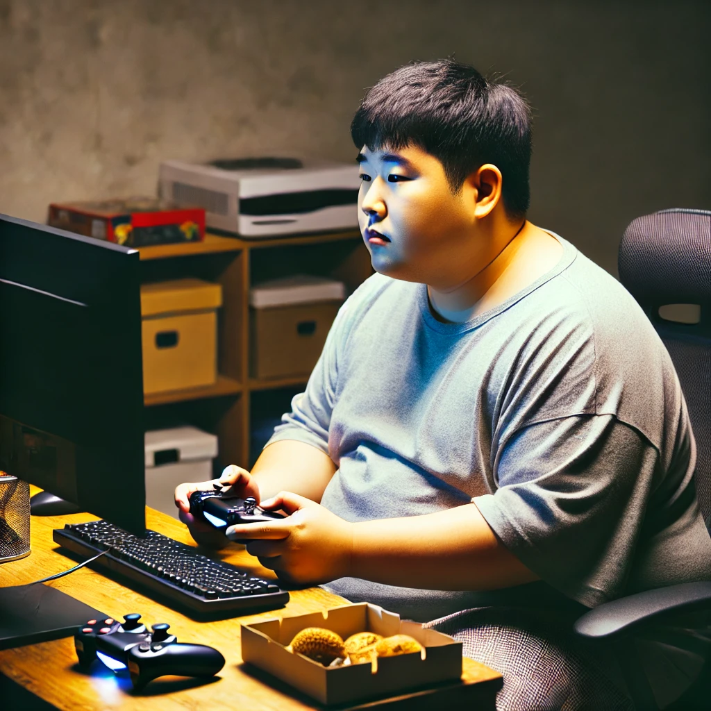 게이머의 숨겨진 운동 비법, 컴퓨터 앞에서 케겔 운동하는 뚱뚱한 남성